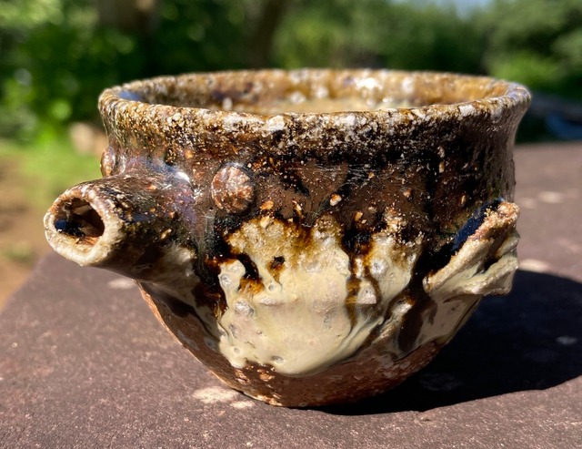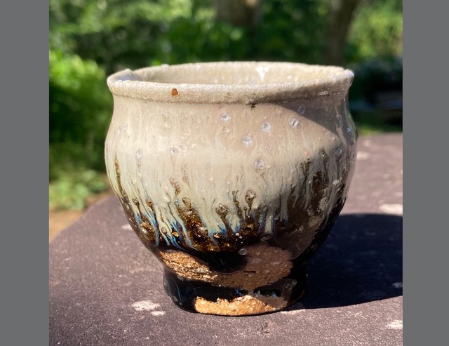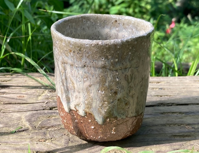 穴窯(あながま)で11日間焼成した自然釉です。 ウイスキーや焼酎に最適の、大きい氷も入るロックカップ。 また普段使いのフリーカップとしても、たっぷりとしたサイズ感です。 これは窯の焚き口から離れたところ(火裏)で焼成されたため、縁と前面に灰が被っています。 灰被りしていない部分の色もよく、火裏焼成の魅力が出ています。 サイズ 口径9.6cm 高さ8.3cm 内容量350ml 電子レンジ使用可能 Anagama fired cup. The texture on the surface results from the ashes from the wood melting on the surface during the eleven days of firing. This rocks glass is perfect for whiskey or shochu, accommodating even large ice cubes. Its generous size also makes it ideal as an everyday free-form cup. 350mL/11.8oz (9.6cm diameter, 8.3cm height) This cup is microwave safe.