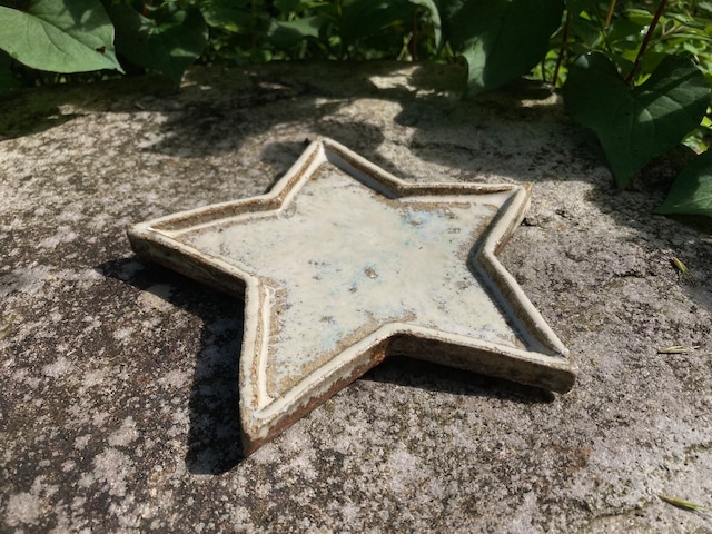 斑唐津は藁灰釉を掛けて高温焼成したものです。 シンプルですが単調でなく、斑らに揺らぐような釉薬の景色が魅力。 遊び心のある星形にしました。足付き・縁付きのなかなか凝った作りです。 サイズ 幅16.5cm 高さ1.8cm 電子レンジ使用可能 A small star shaped plate with madara glaze. The spots of blue are a charming point of this plate. Madara-karatsu ware is fired at high temperatures with a straw ash glaze applied. Its characteristics are simple yet not monotonous, and the texture of its glaze is charming and captivating. 16.5cm at widest point, 1.8cm height This plate is microwave safe.