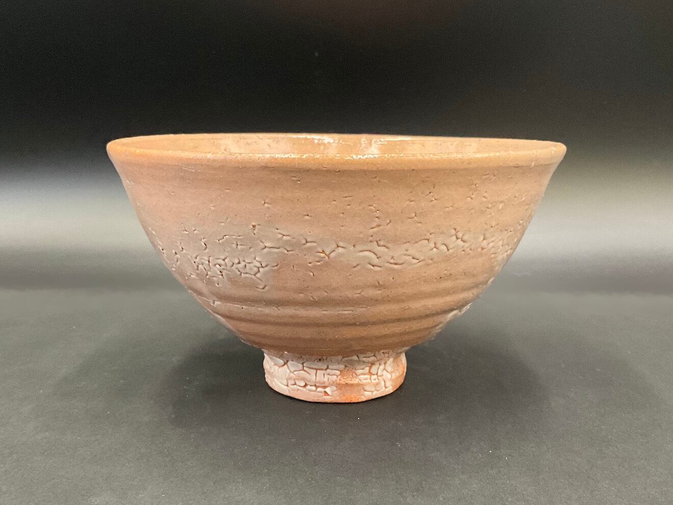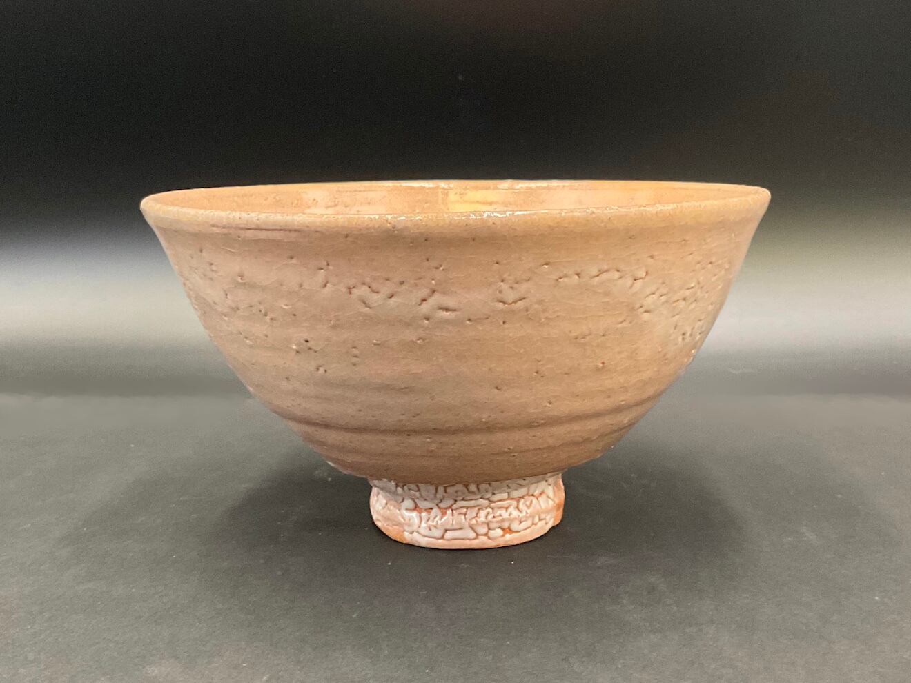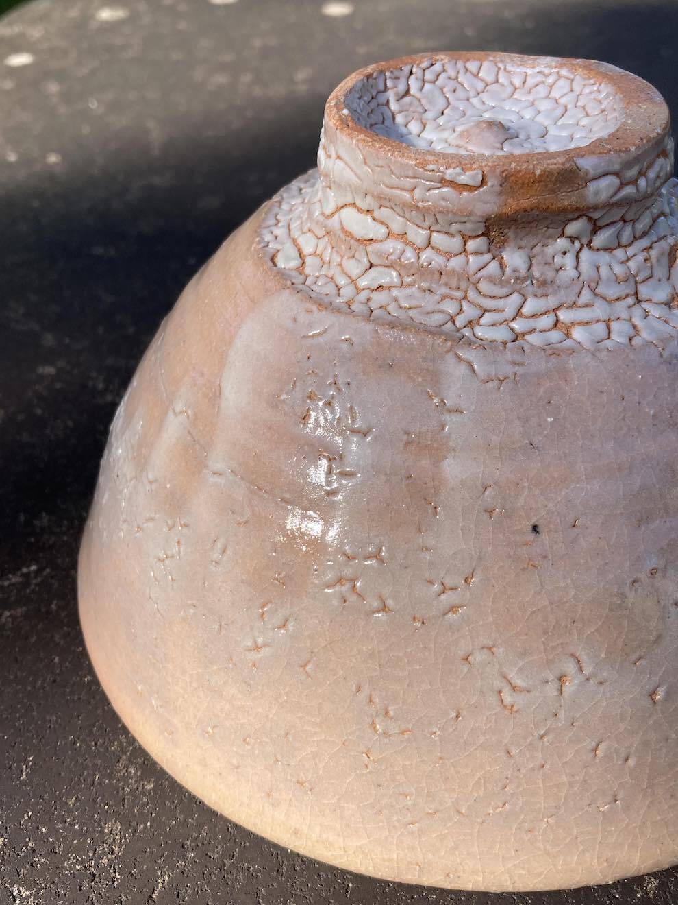 Wood-fired matcha bowl for traditional matcha ceremony. The oo-ido matcha bowl is known for its distinct features, such as its biwa color, kairagi (cracked texture of glaze that has not fully melted), meato (unglazed spots left from little balls of clay used to stack bowls when firing), and rokurome (spiral marks that were made as the piece was thrown on the wheel). The beauty of these bowls are found in its imperfections such as these.
