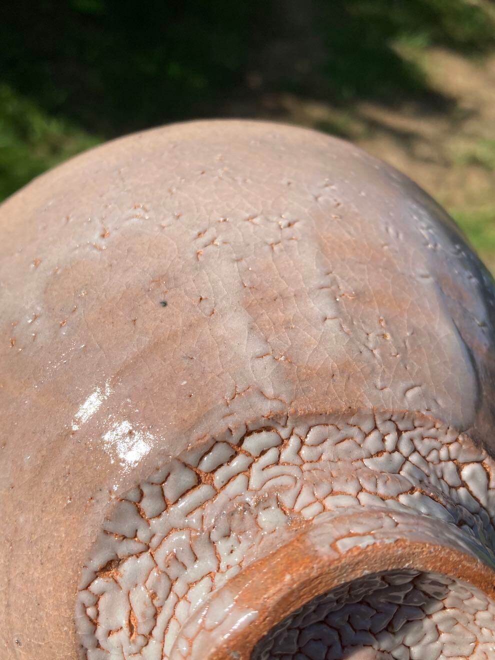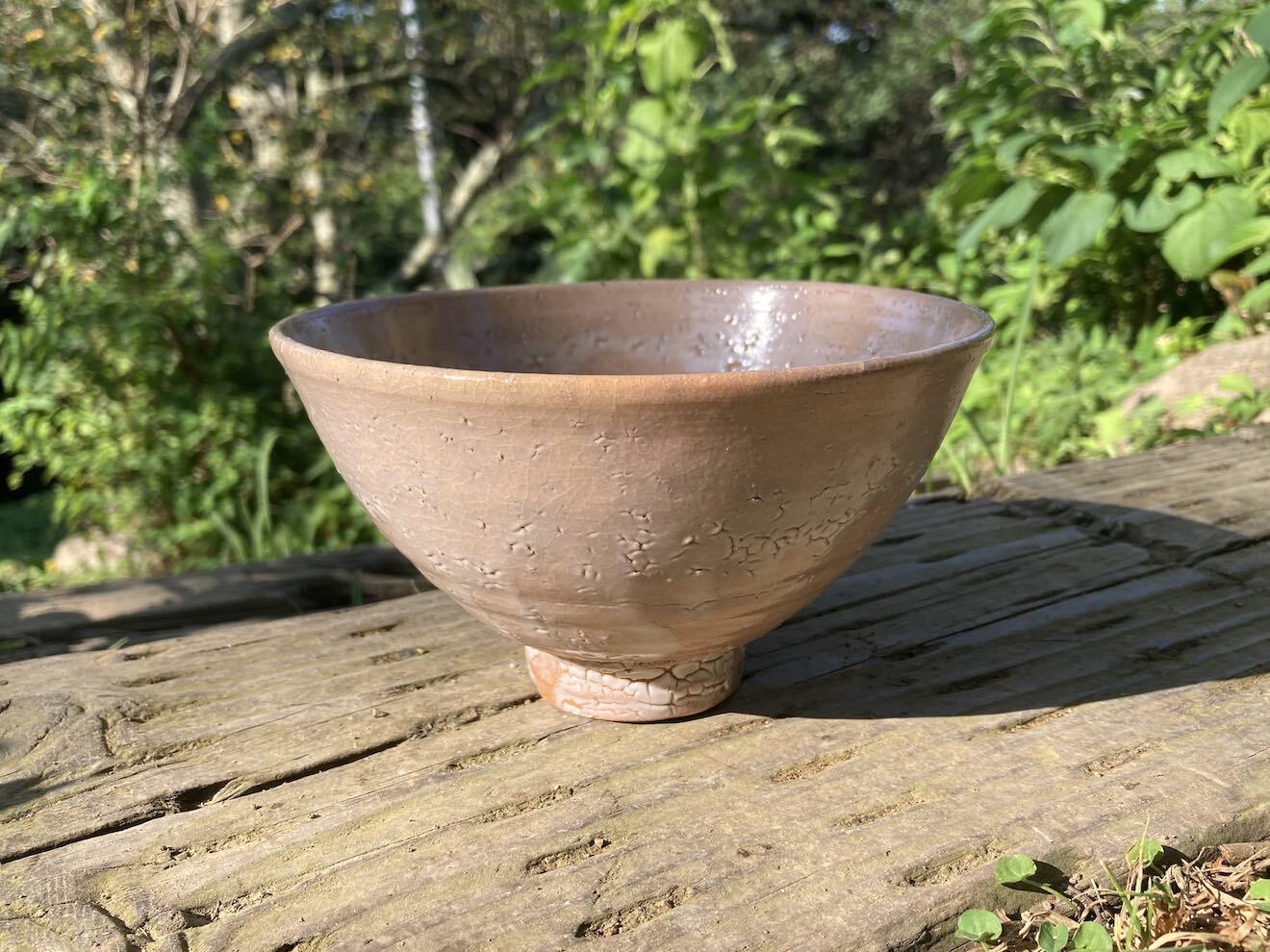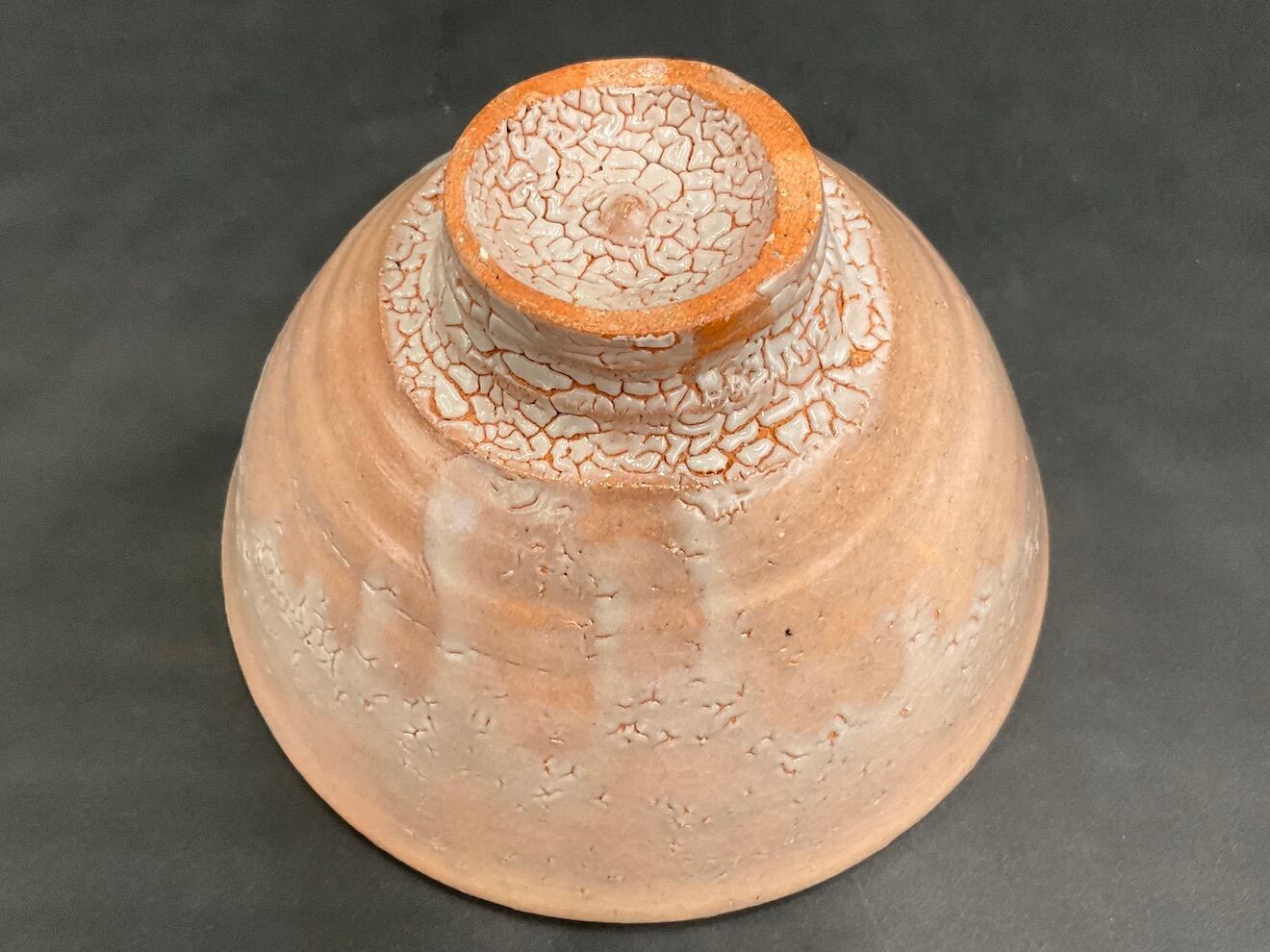 Wood-fired matcha bowl for traditional matcha ceremony. The oo-ido matcha bowl is known for its distinct features, such as its biwa color, kairagi (cracked texture of glaze that has not fully melted), meato (unglazed spots left from little balls of clay used to stack bowls when firing), and rokurome (spiral marks that were made as the piece was thrown on the wheel). The beauty of these bowls are found in its imperfections such as these.
