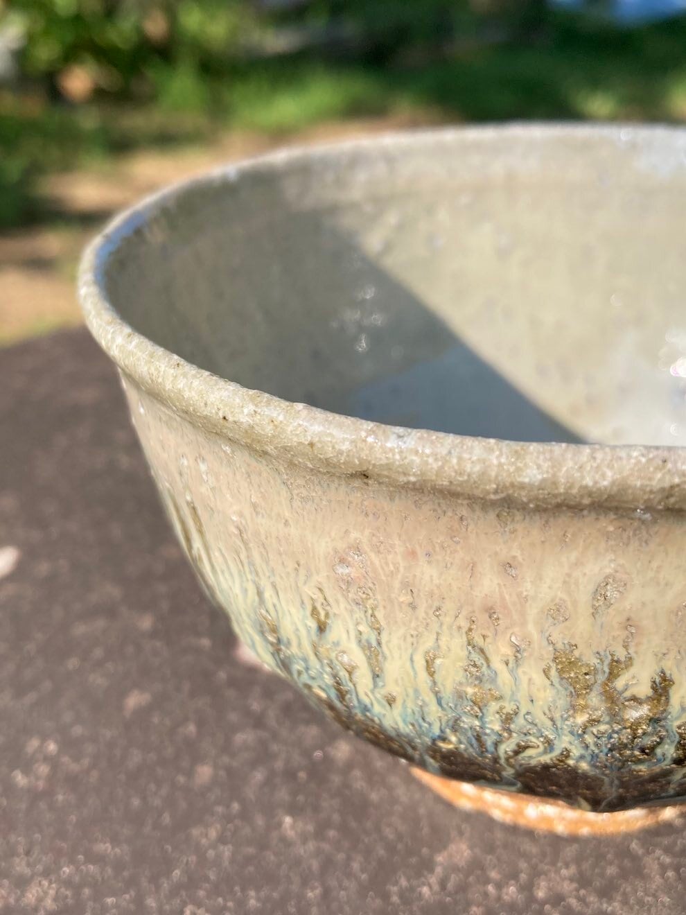 二種の釉薬が高温で溶けて混ざり合ったところに綺麗な青、縁周りの藁灰釉部分には淡いピンク色も出ていて、薪窯ならではの良い景色の茶盌となりました。