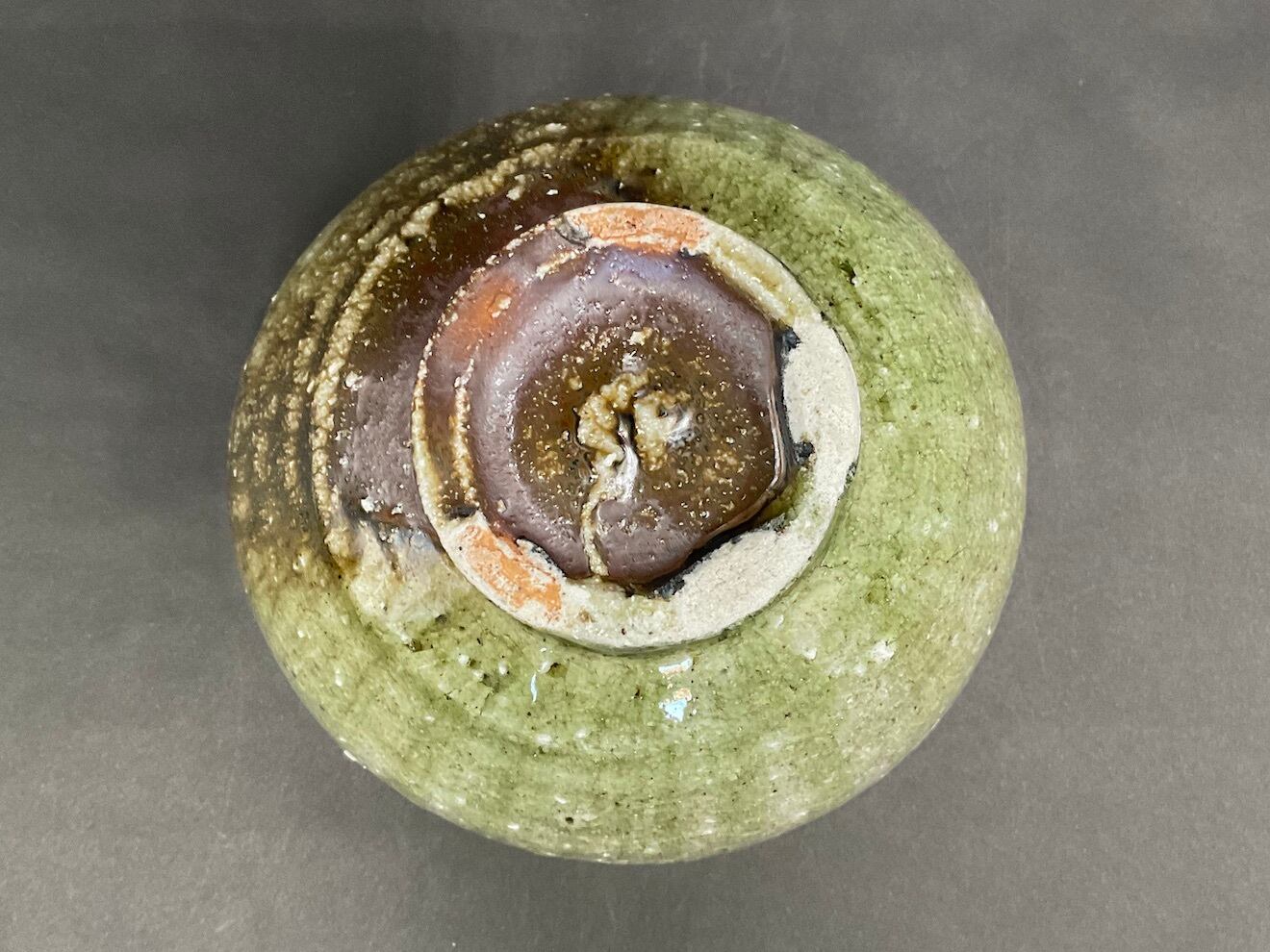 窯焚き中、薪の灰を被り高温で溶けた部分は緑色がかったガラス質のビードロになります。