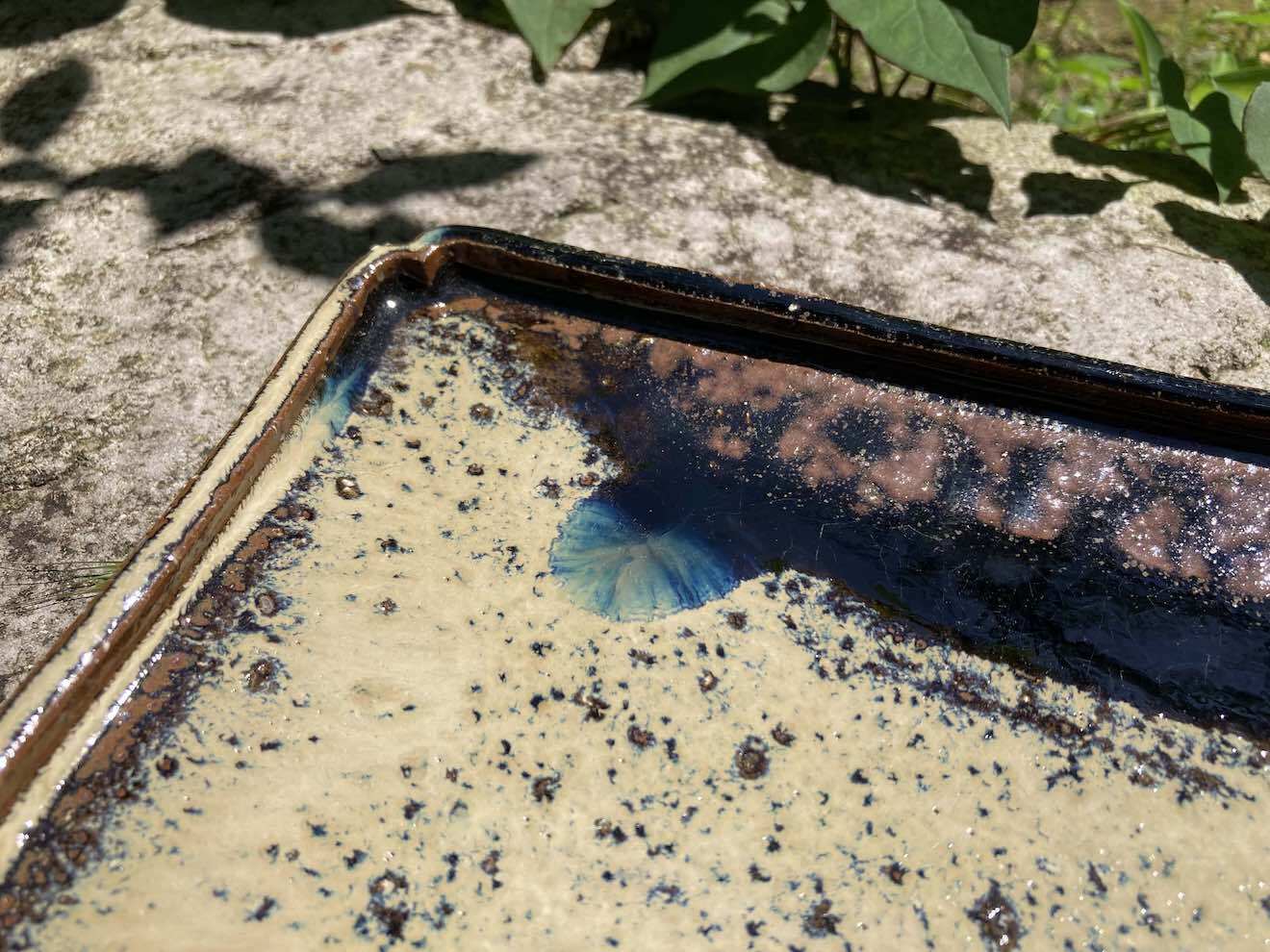 釉薬の境目に青色が出ていて、その釉薬の景色が料理を引き立てます。
