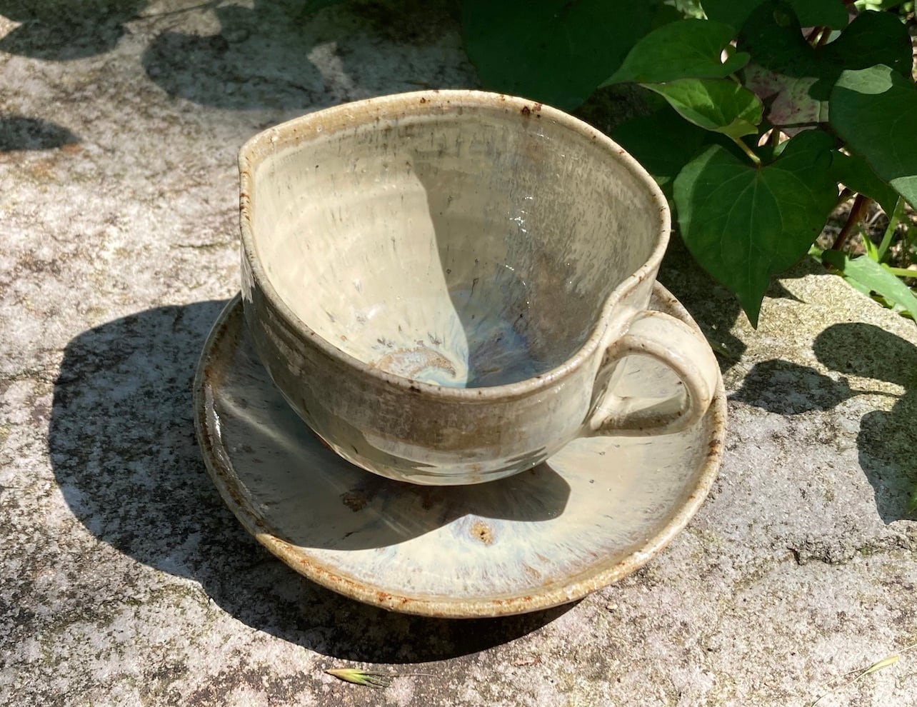 Madara-glaze heart shaped cup and saucer pair. For a warm drink in the afternoon.