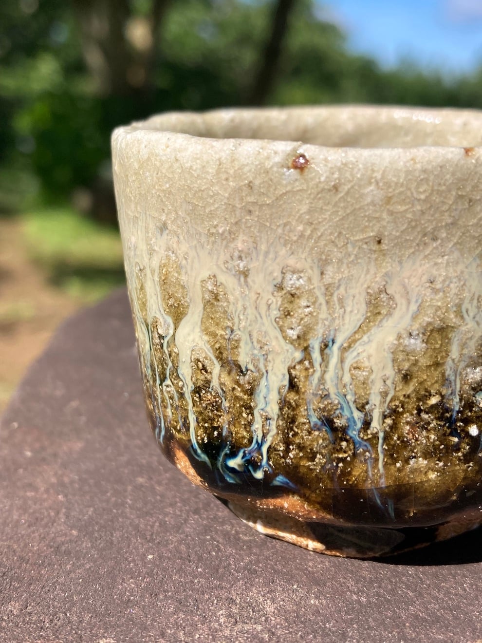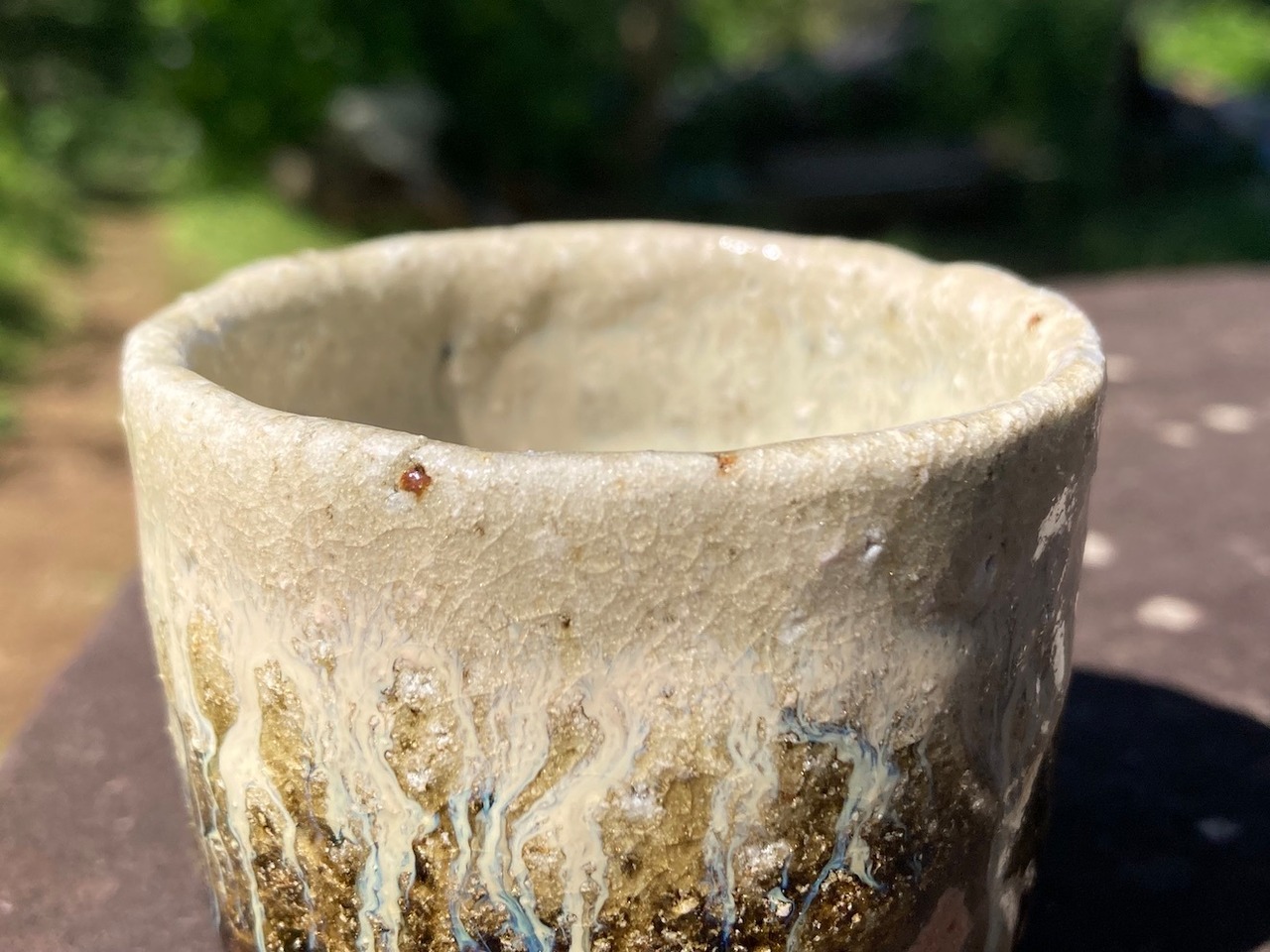 朝鮮唐津は藁灰釉と飴釉の二種類の釉薬を掛けて、窯の中で一番温度の上がるところで焼きます。