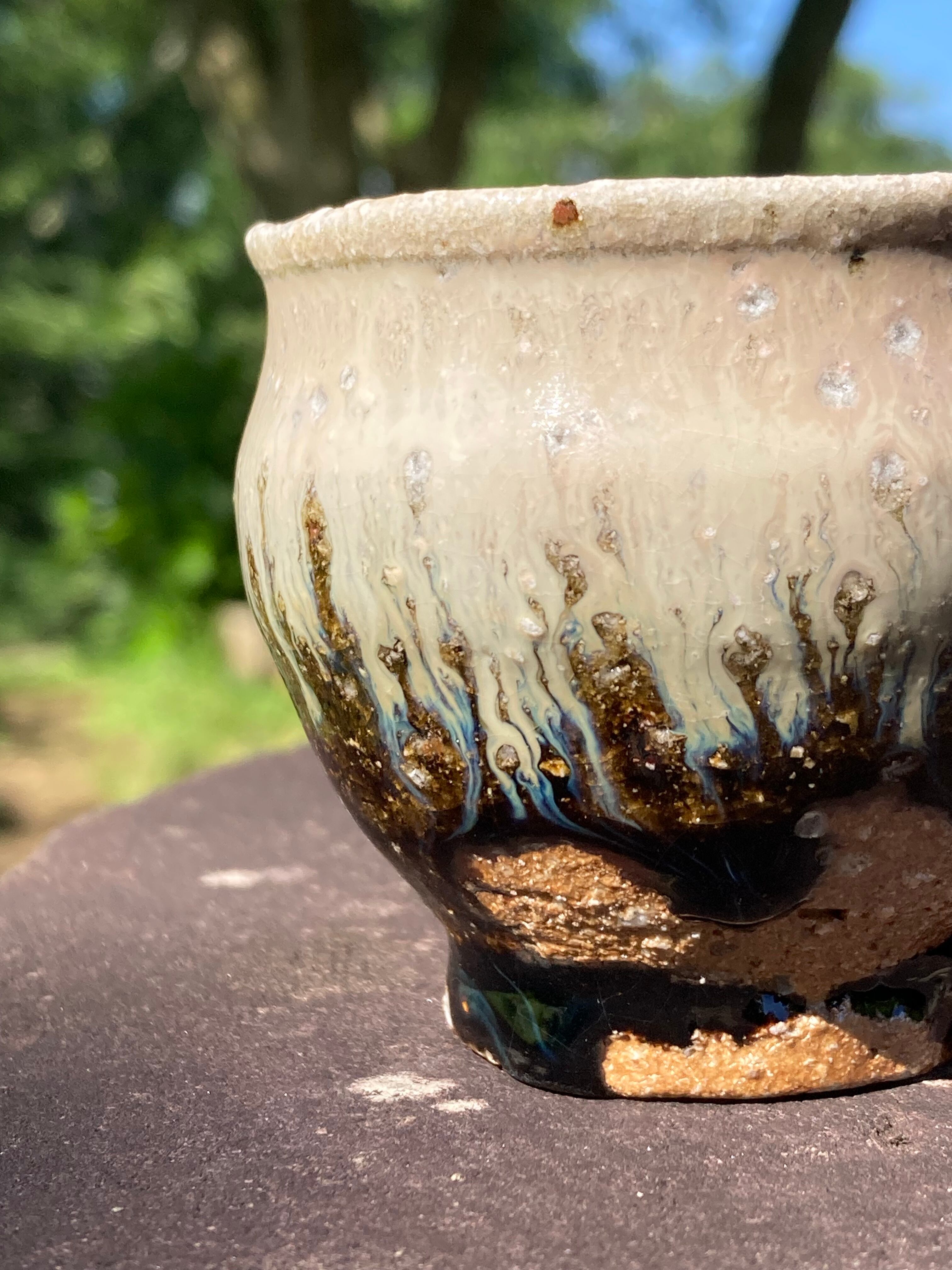 朝鮮唐津は藁灰釉と飴釉の二種類の釉薬を掛けて、窯の中で一番温度の上がるところで焼きます。