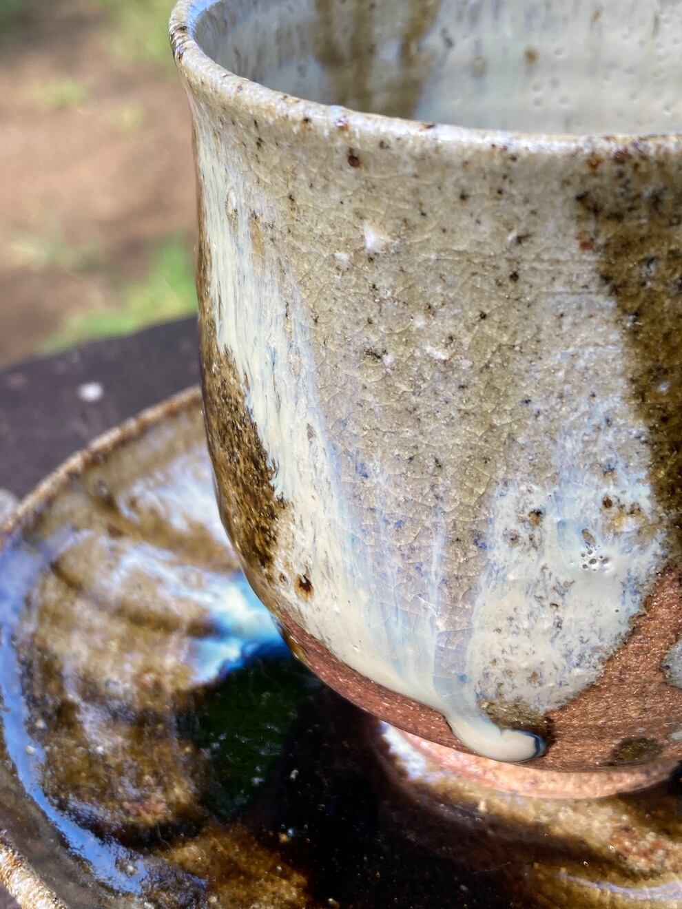 Wood-fired cup and saucer pair, decorated with a variety of glazes.