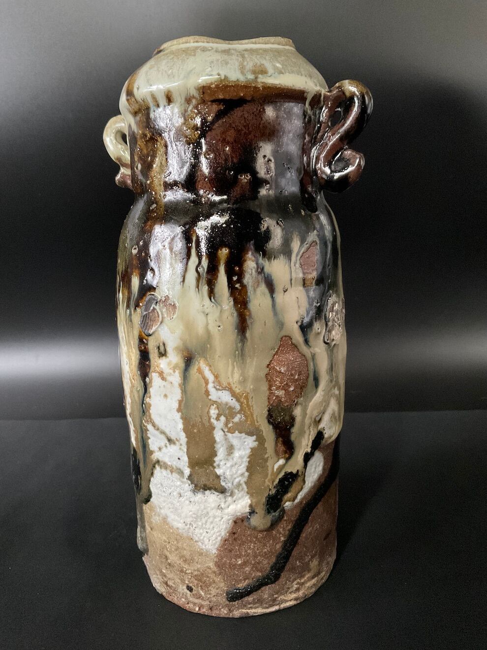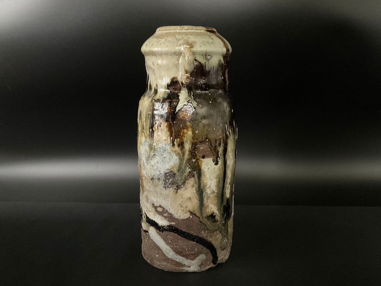 焼成時(登り窯)に薪の灰が付着し窯変した朝鮮唐津の花入です。