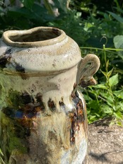 Kiln-change refers to the technique of intentionally dropping (or tipping over) the vase into the wood ash while the kiln is being fired, in order to create variations in the glaze.