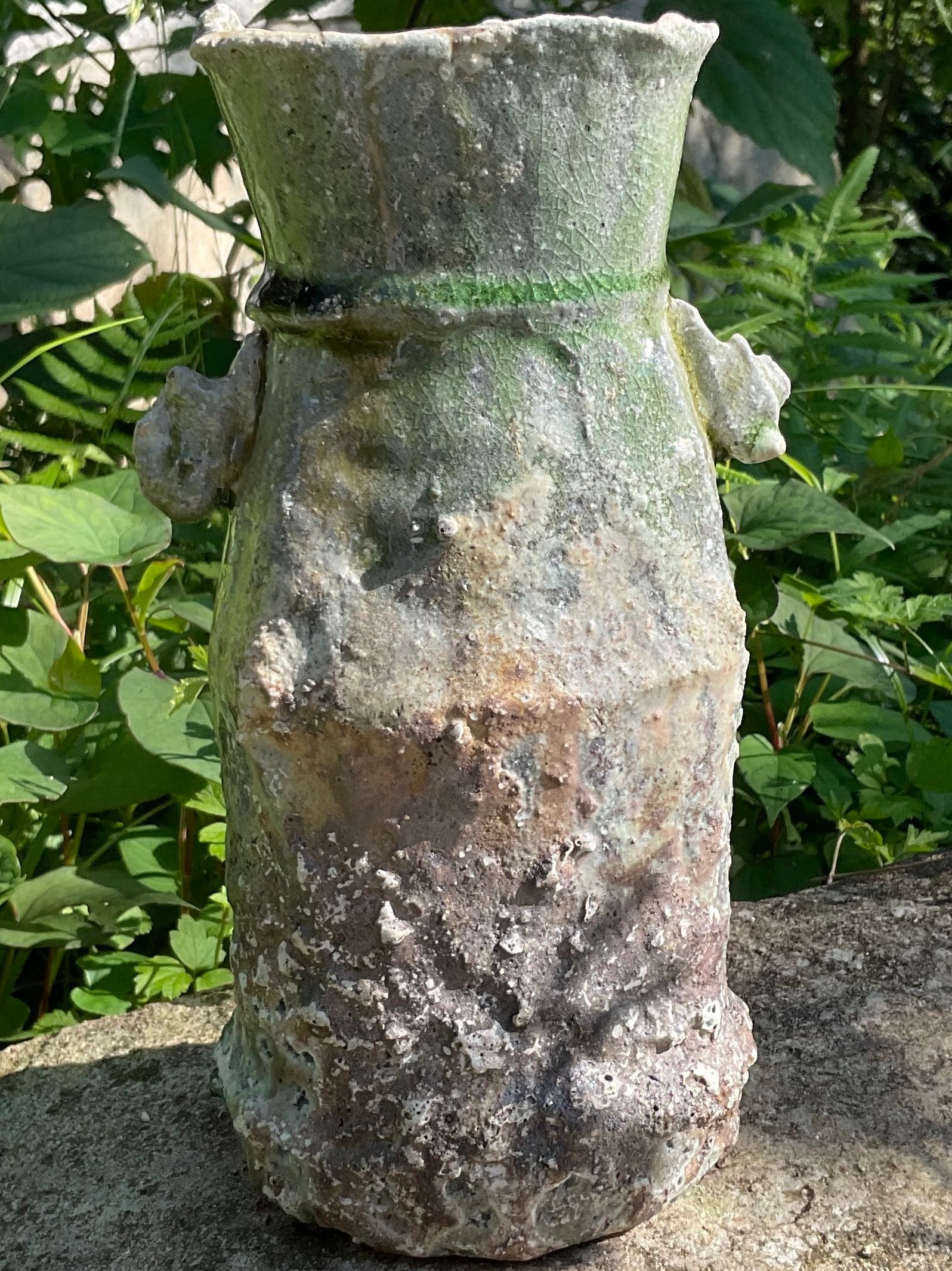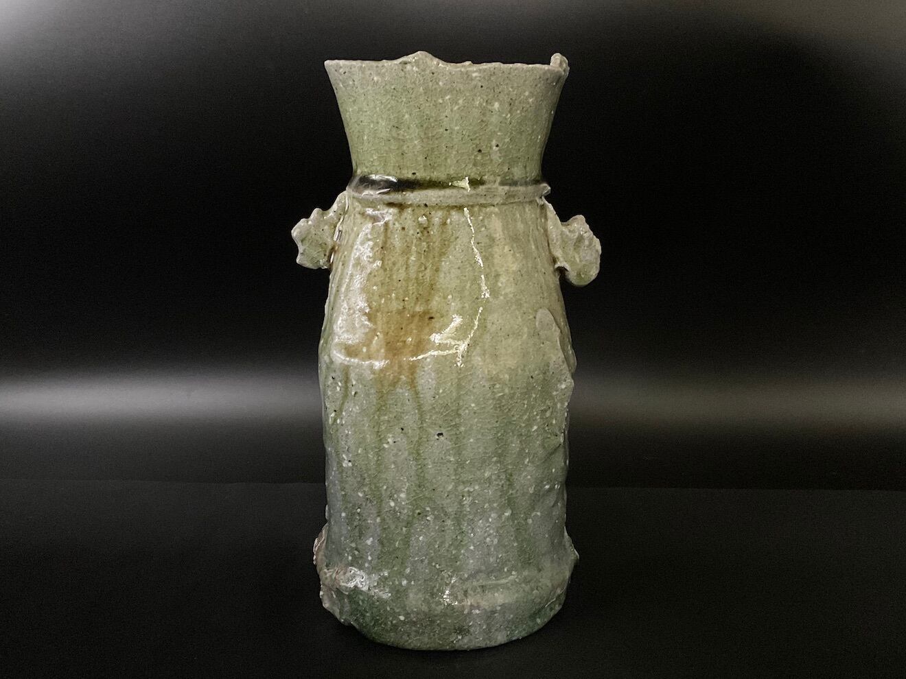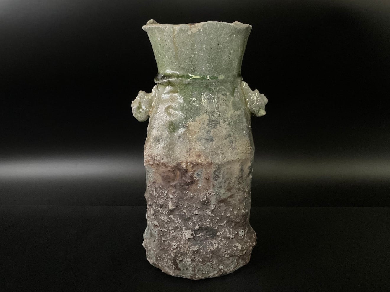 唐津灰被耳付花入/Anagama ash-glaze flower vase
