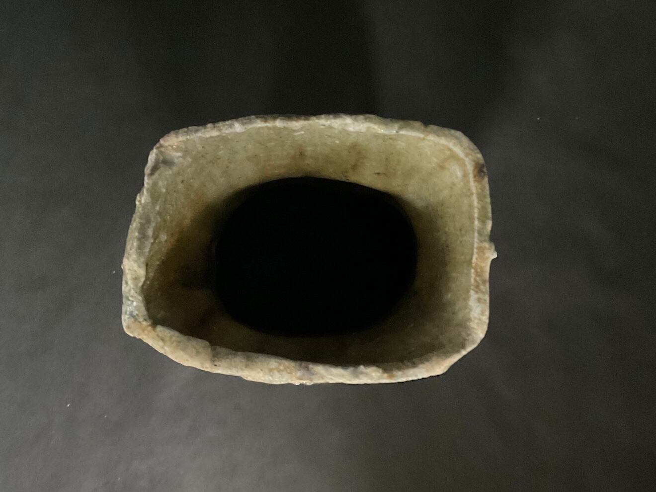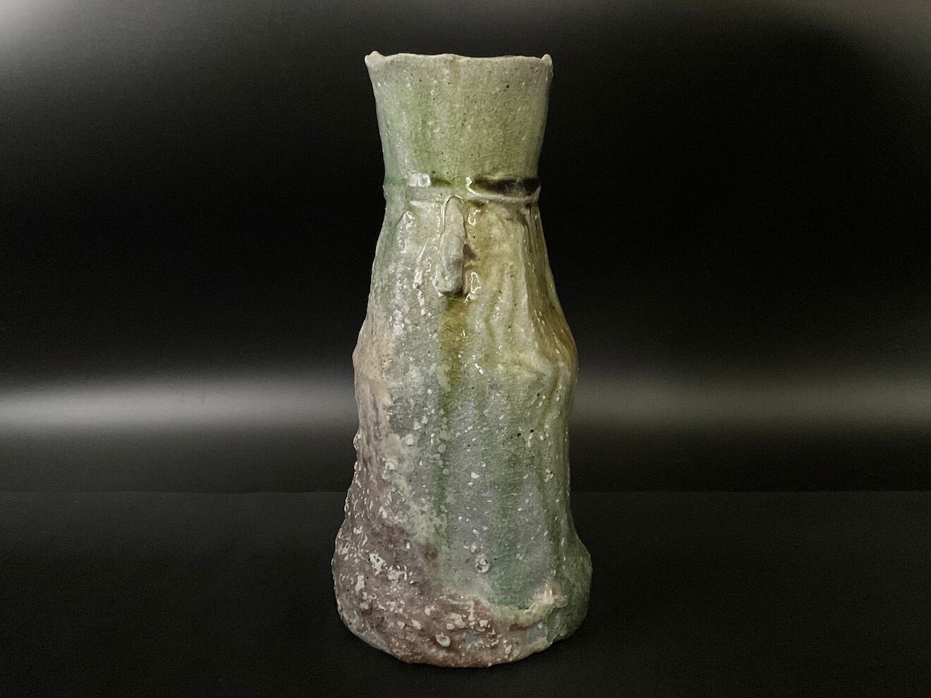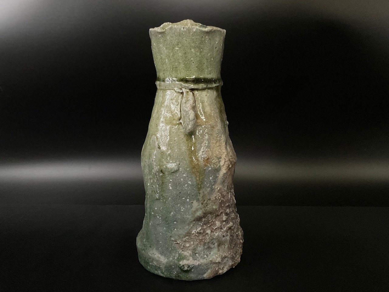 正面下の、灰に埋もれて焼成された部分はごつごつとした独特の質感になり、上のくびれた部分は灰がたまり冴えた緑色が出ています。