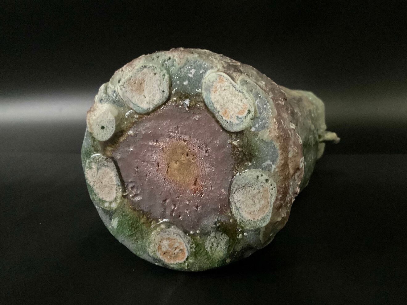 The lower front section, which was fired while buried in ash, has developed a distinctive, rugged texture, while the narrower upper section has accumulated ash, revealing a vivid green hue.