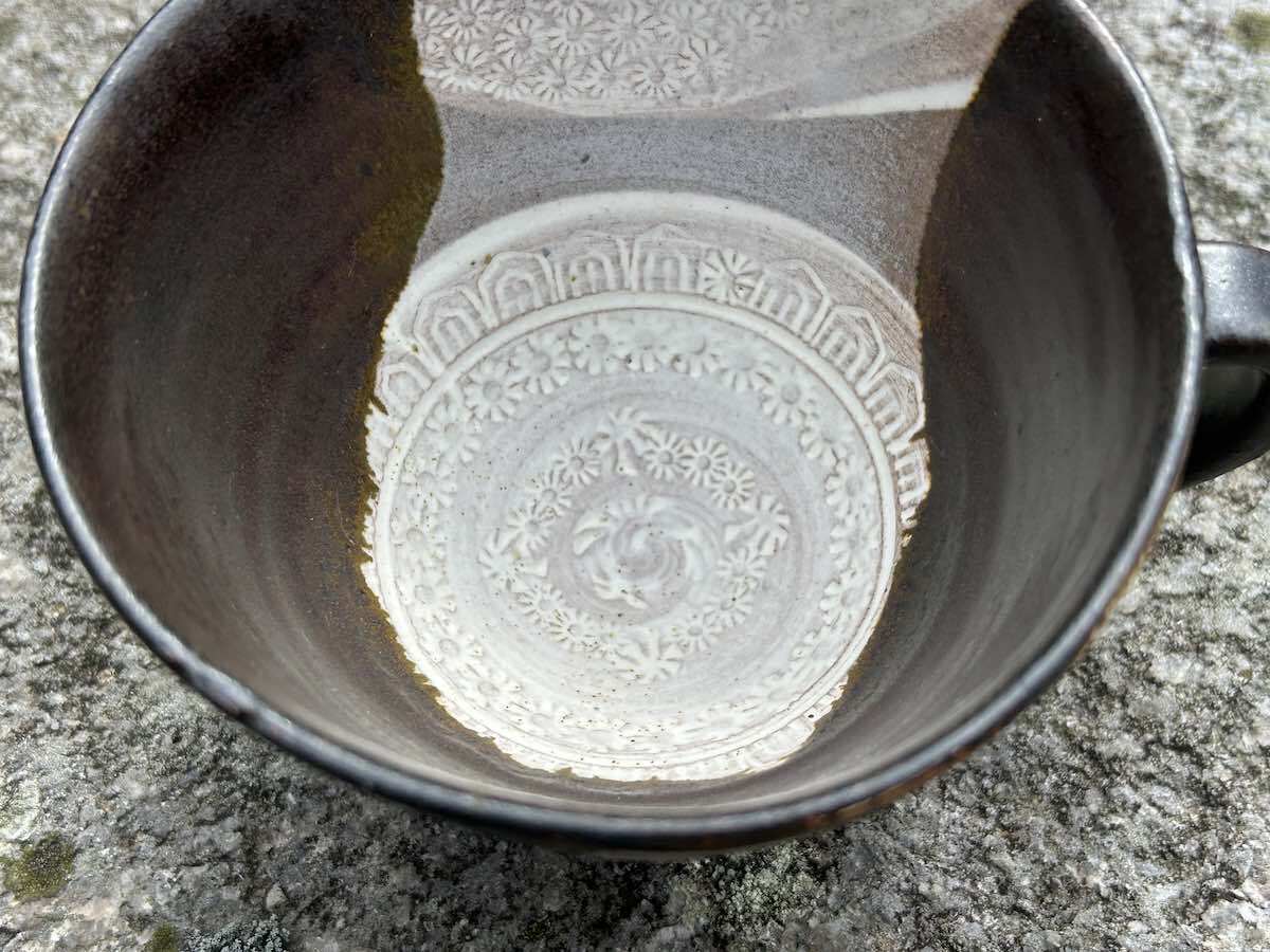 作ってまだ乾いていない状態で、色んな模様の印鑑を押し、白い土を塗っています。(白化粧・刷毛目)