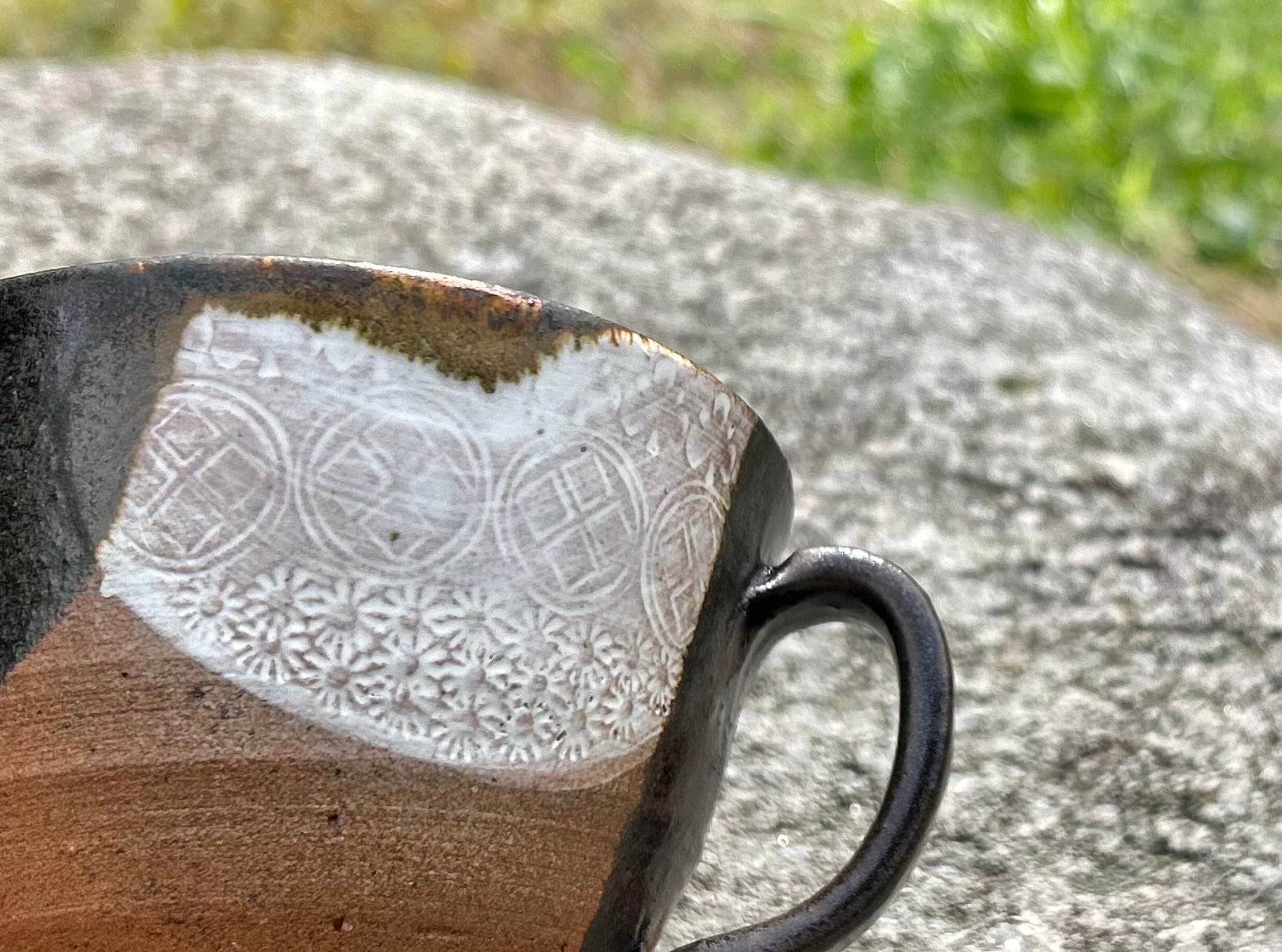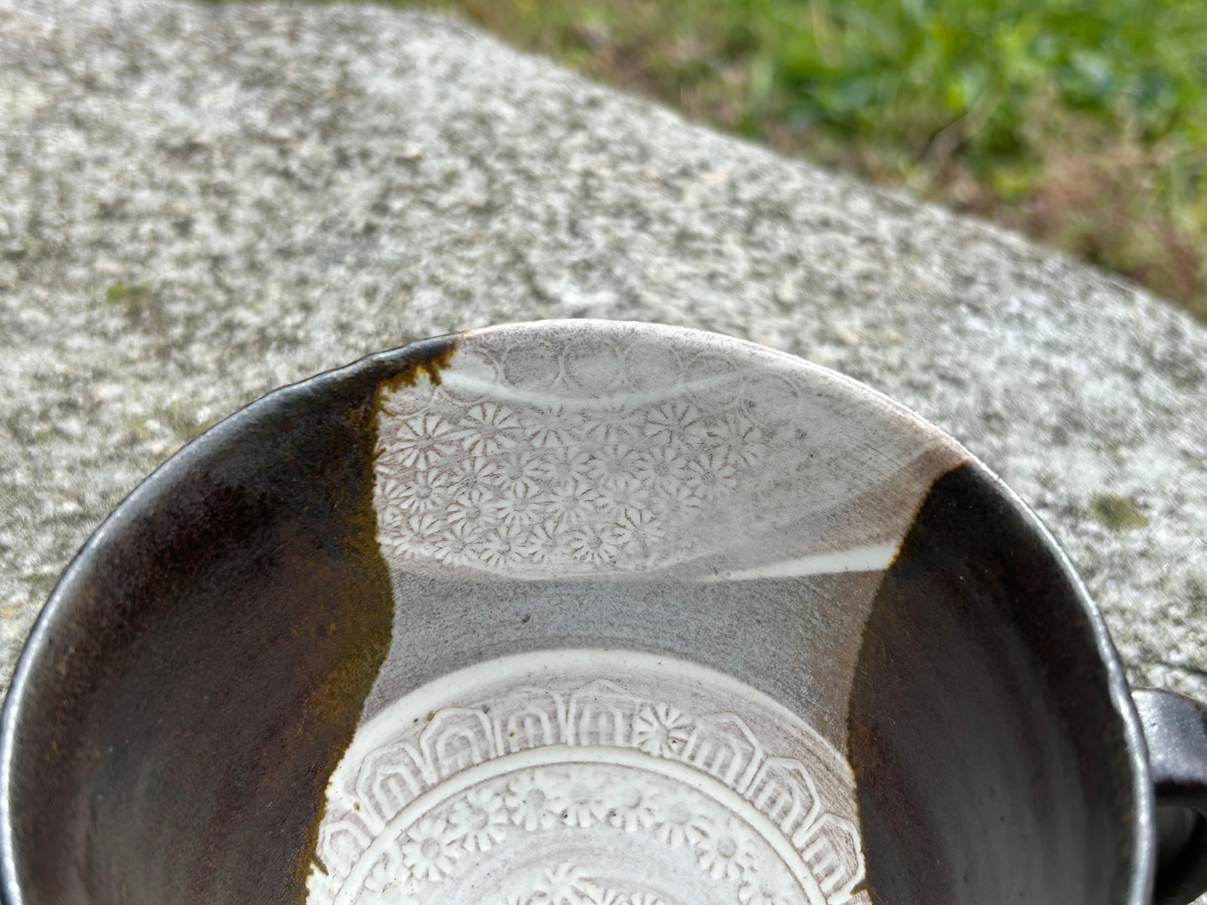 While the clay was still soft and not yet dry, various patterned stamps were pressed into the surface, and a layer of white slip was applied (hakeme / brushed white slip). After the bisque firing, it was finished with a combination of iron glaze and a semi-transparent glaze.