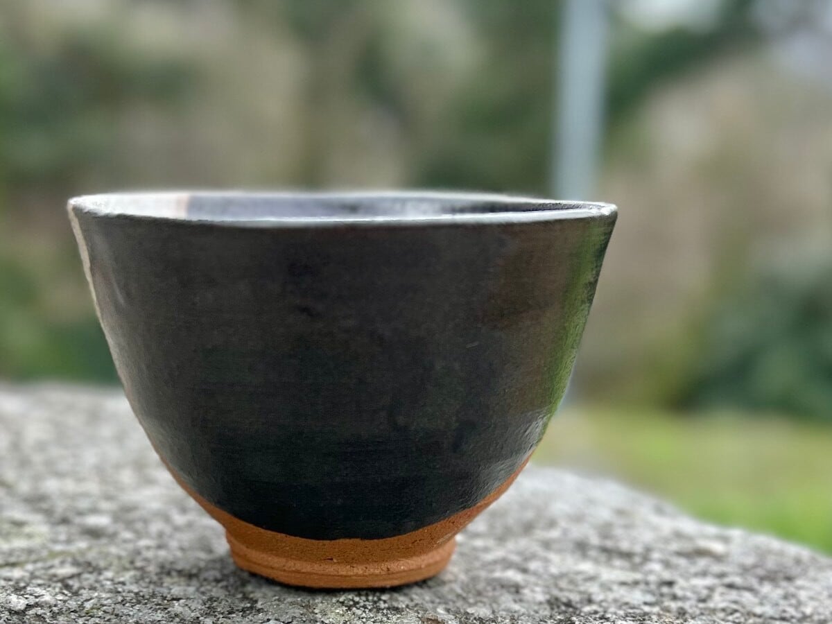 素焼きした後、鉄釉と半透明を掛け分けています。