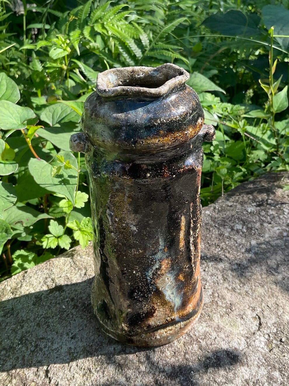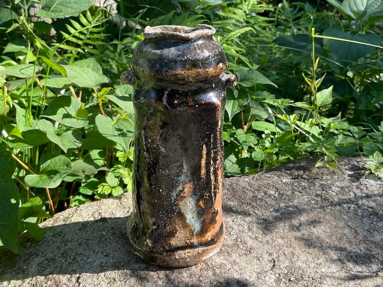 Kiln-change refers to the technique of intentionally dropping (or tipping over) the vase into the wood ash while the kiln is being fired, in order to create variations in the glaze.