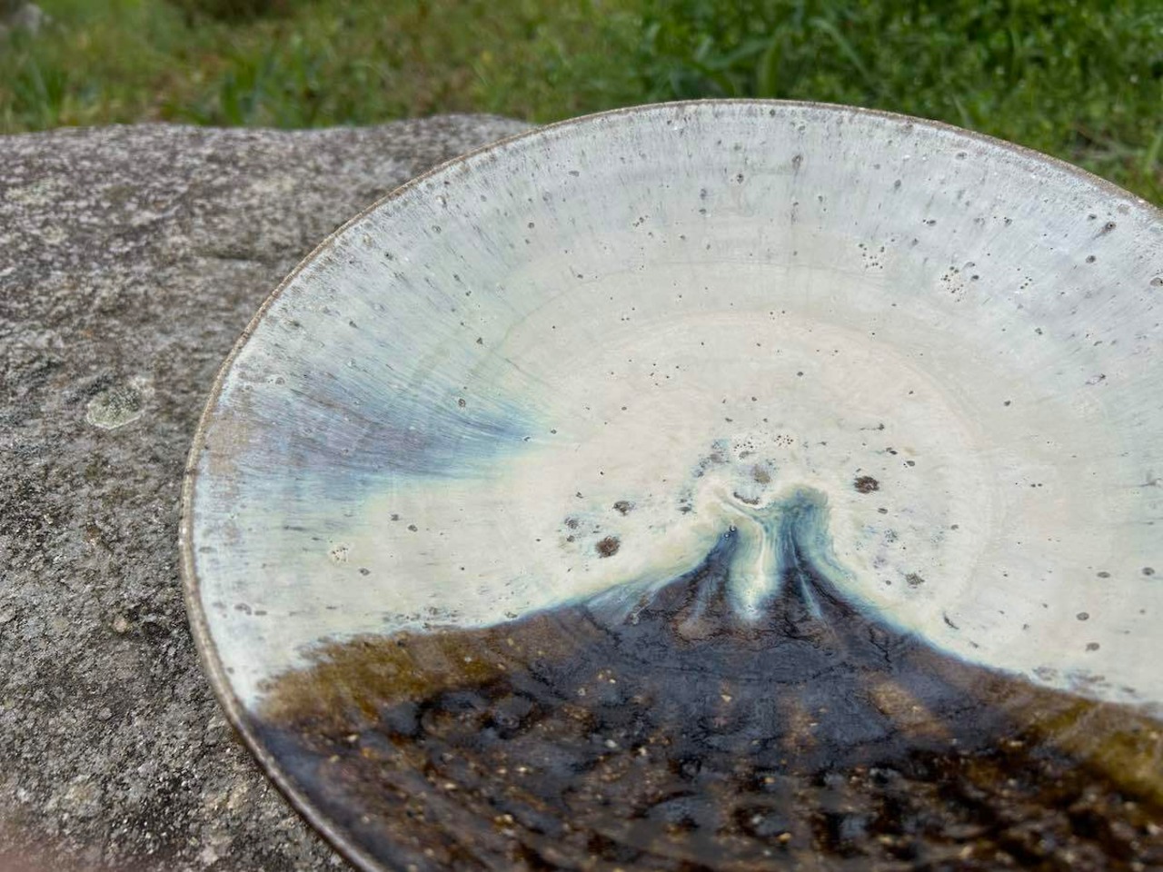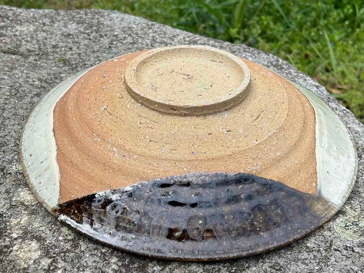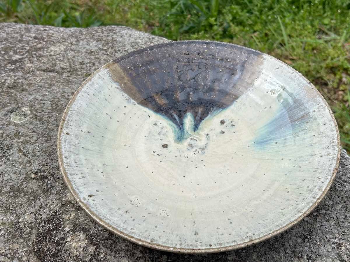 藁灰釉と飴釉が焼成時に混じり合い、青が出ています。薪の灰が降りかかり、水色が出ています。
