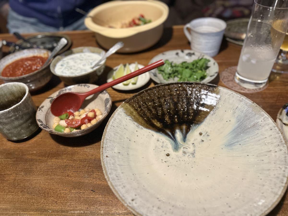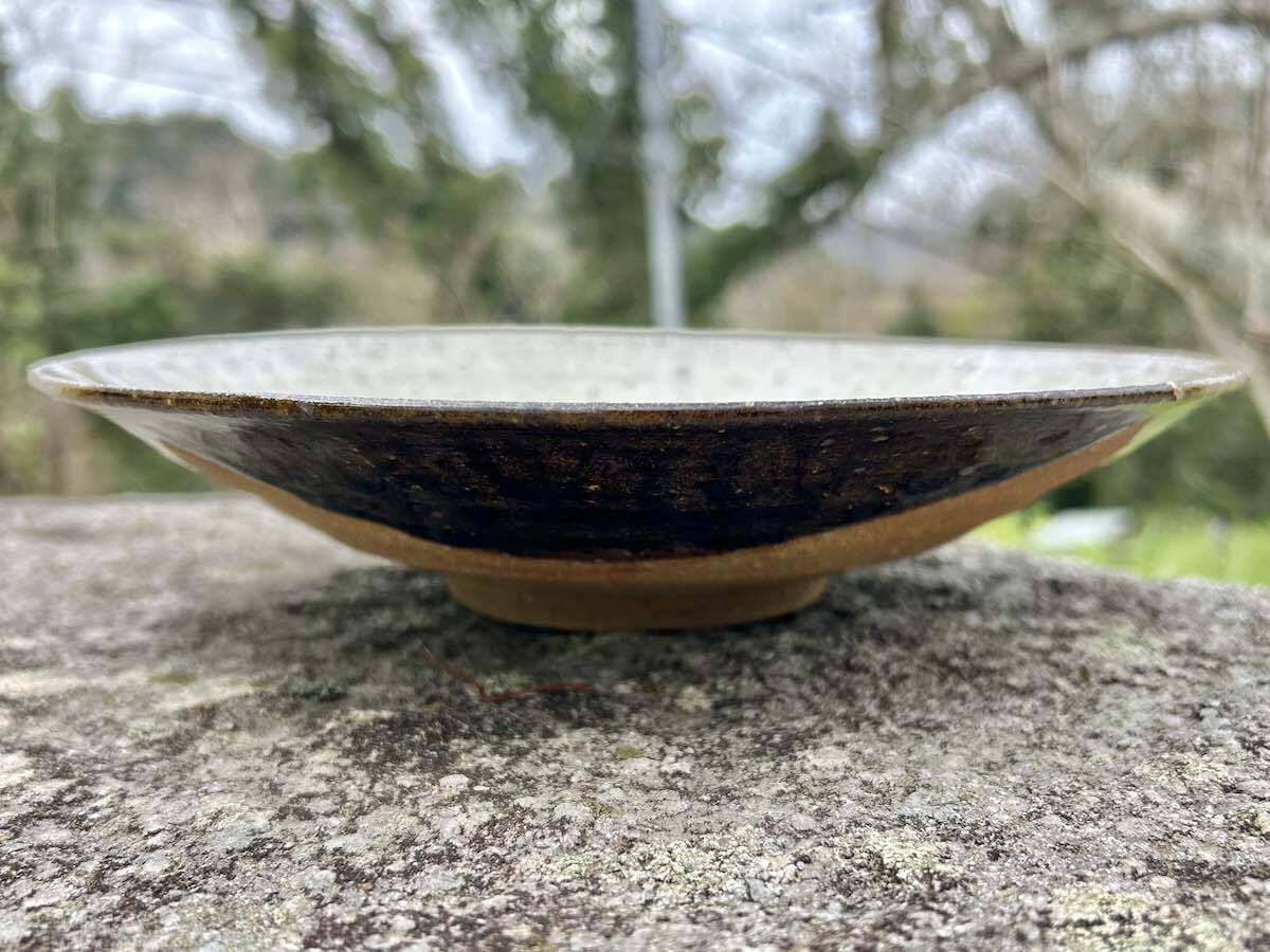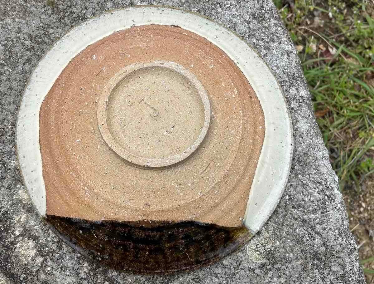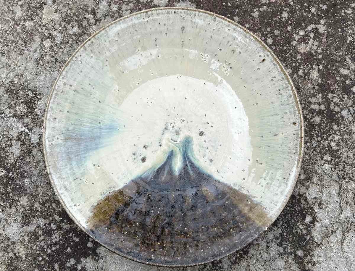 藁灰釉と飴釉が焼成時に混じり合い、青が出ています。薪の灰が降りかかり、水色が出ています。