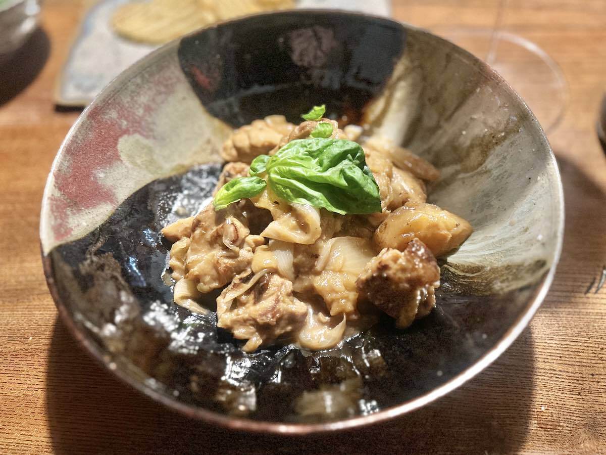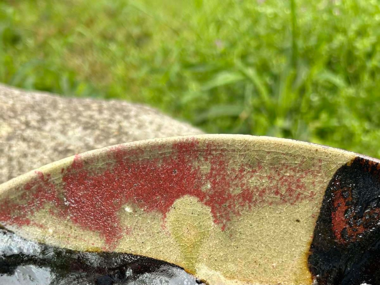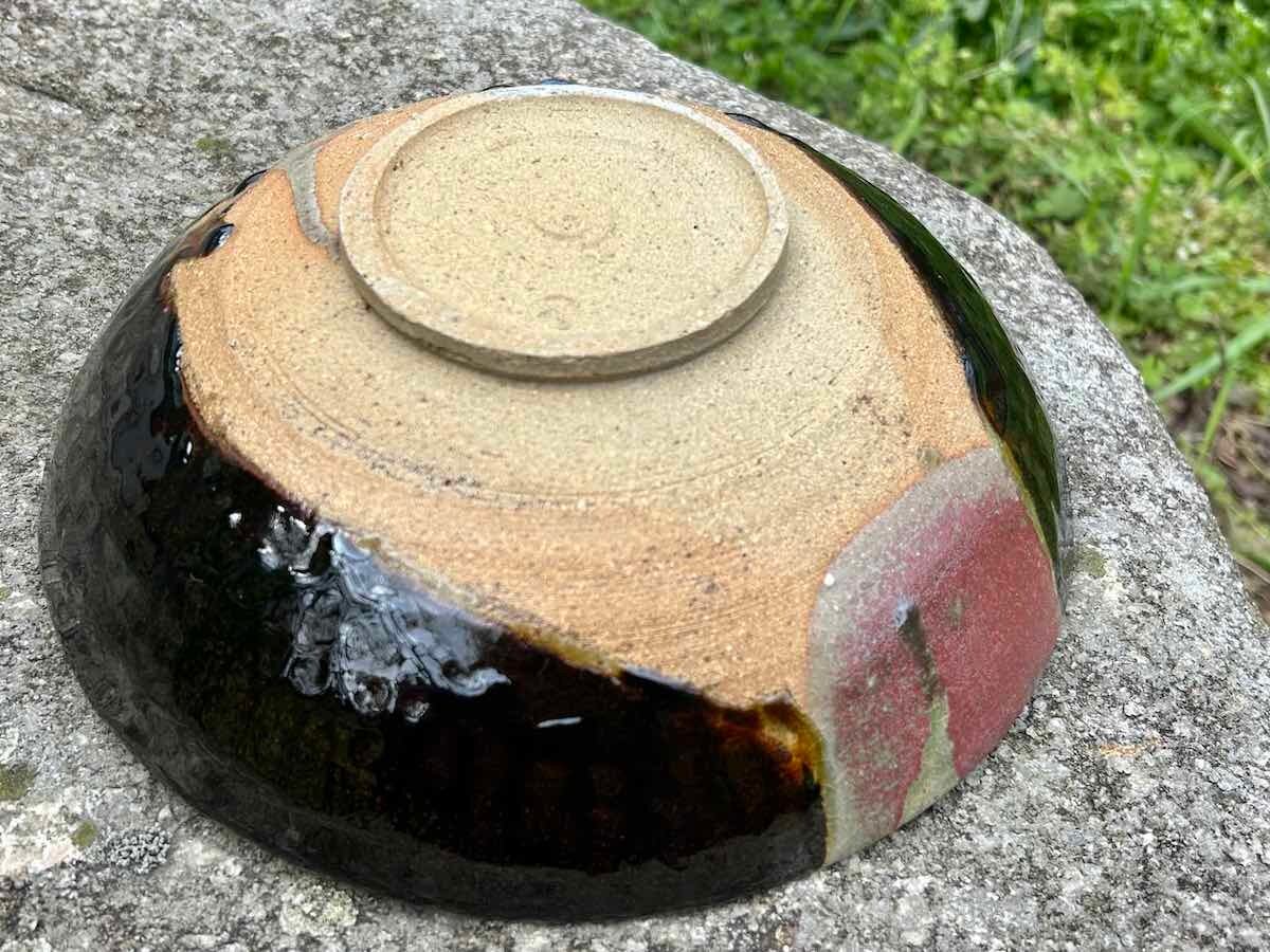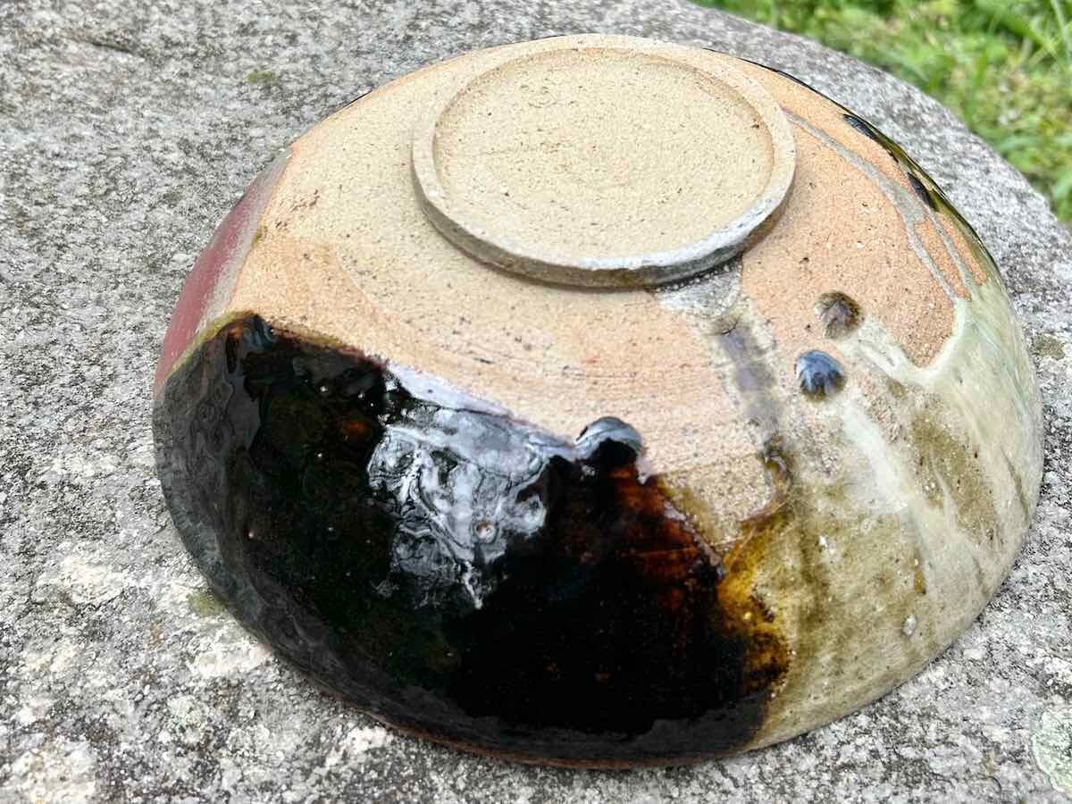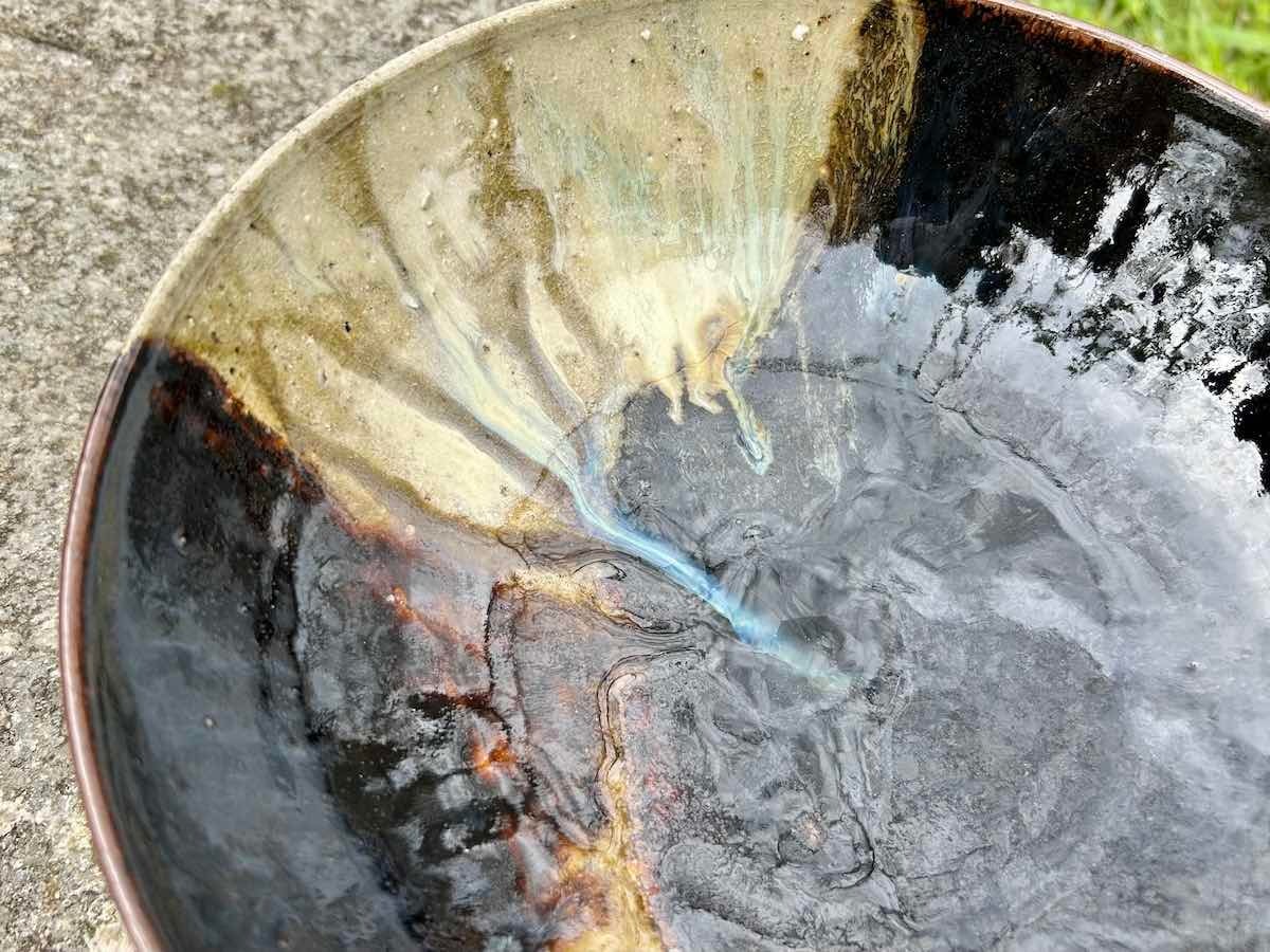 竹灰と飴釉が混ざり青色になり、流れ、景色となりました。胴釉の赤が、いいアクセントとなっています。