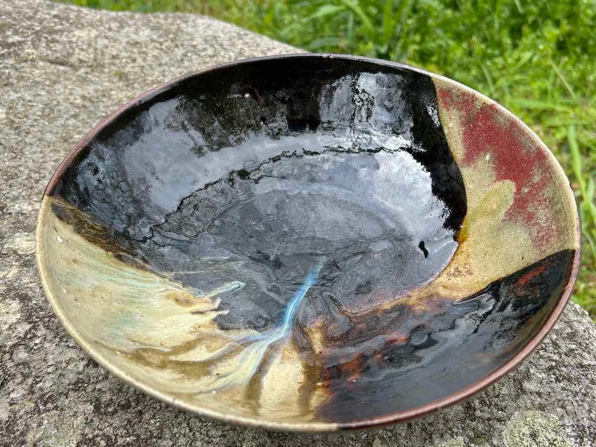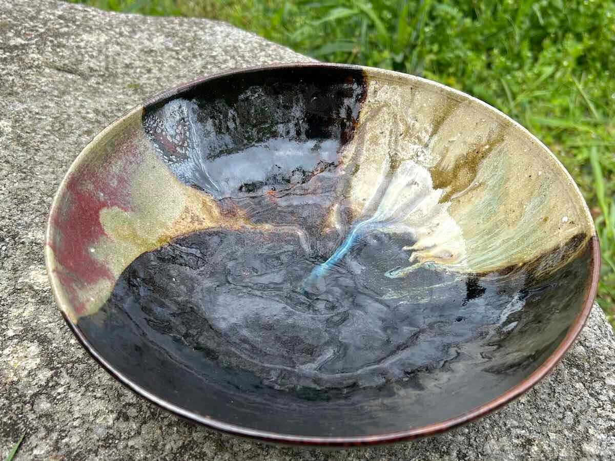 五種類の釉薬を使い、焼成で釉薬が溶けて混じり合い、どこにもないデザインになりました。